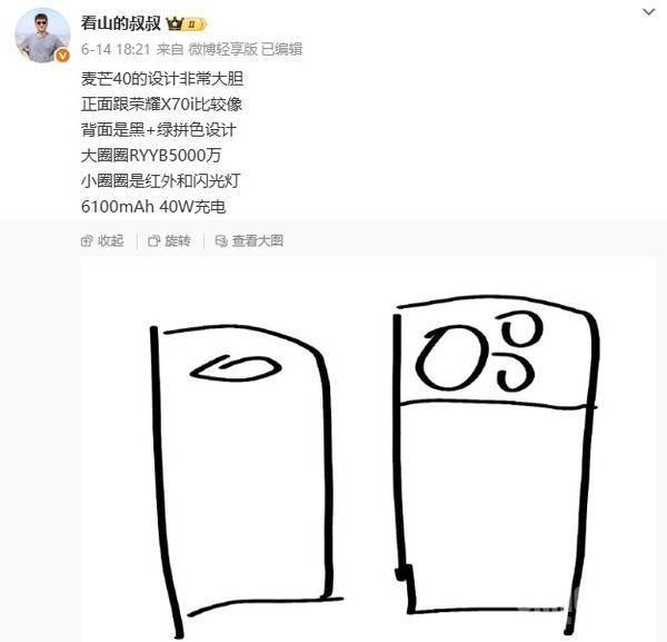 据这位博主描述,麦芒40在设计上相当激进,其正面造型与荣耀X70i颇为相似,采用了独特的药丸形挖孔屏设计。而背面则采用了黑绿拼接的配色方案,这一大胆的设计语言在目前的手机市场中并不多见。博主还分享了一张草图,图中显示手机背面采用了上下分割的设计,上方的摄像头模组占据了较大面积,左侧的大圆圈内安置了一颗5000万像素的RYYB主摄,右侧小圆圈则容纳了红外传感器和闪光灯。